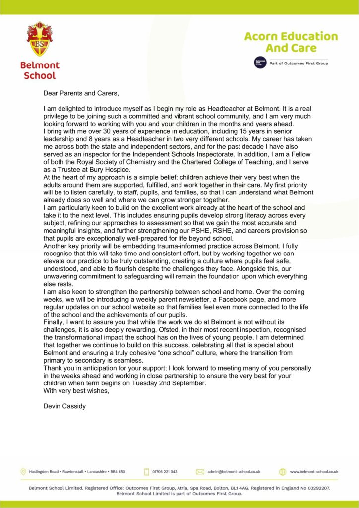 We are pleased to announce that we have appointed a new Head Teacher, Mr Devin Cassidy, who will over see both school sites. Mrs Johnson and Mr Taylor will continue to be the head of school for our primary site and secondary site retrospectively. Please see the attached letter from Mr Cassidy introducing himself.